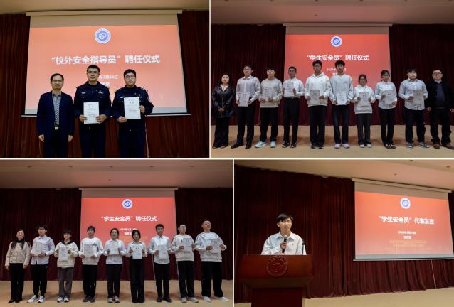 还分别成立了“学生安全员”队伍,由本研班委和学生骨干组成,胡宝林和张娅莉、曹娜为学生代表颁发了聘书。本科生魏政杰代表受聘学生发言,表达了认真履职、发挥朋辈引领作用,做好知识宣传员、信息反馈员和平安校园守护者的决心和信心。